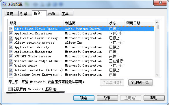 3、单击“服务”选项卡,单击以选择“隐藏所有 Microsoft服务”复选框,然后单击“全部禁用”。