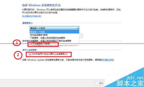 4、选择“从不检查更新”,并去掉“允许所有计算机用户安装更新”选中状态。确定即可,并重新启动看是否能顺利进入。