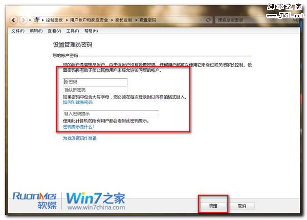 首先呢,我们需要设置电脑的管理员密码,不然任何用户都可以跳过和关闭家长控制功能。以计算机管理员身份登录Win7系统后,打开“控制面板”,单击“用户账户和家庭安全”下的“为所有用户设置家长控制”,进入“家长控制”窗口,单击“计算机管理员”帐户,进入“设置密码”窗口,设置好管理员密码。