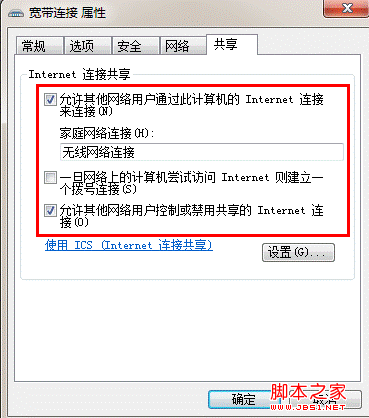 手动检查是否开启共享的方法,如下图本机使用ADSL拨号上网所以要确认宽带连接属性中的共享已经开启