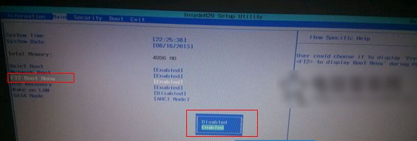 第二步:按ESC返回BIOS操作界面,找到Main标签,选择“F12 BOOT Menu”选项,将Disable改为Enable,按ESC,选择SAVE保存退出.