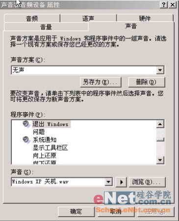 首先,你可确定“退出Windows”声音文件是否已毁坏——单击“开始”→“设置”→“控制面板”,然后双击“声音”。在“事件”框中,单击“退出Windows”。在“名称”中,单击“(无)”,然后单击“确定”,接着关闭计算机。如果Windows正常关闭,则问题是由退出声音文件所引起的,要解决这一问题,请选择下列某项操作:从备份中恢复声音文件;重新安装提供声音文件的程序;将Windows配置为不播放“退出Windows”的声音文件(如图1)。