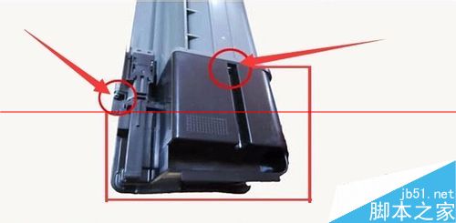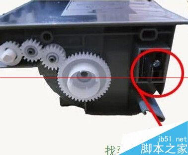 4、好了,闲话休说,下面我们就一起来加碳粉。将碳粉盒翻过来,找到红圈中的两个螺丝,用螺丝刀打开它们,将废粉盒与粉盒分开来,长的那个是粉盒,短的那个是废粉盒。好图所示: