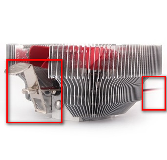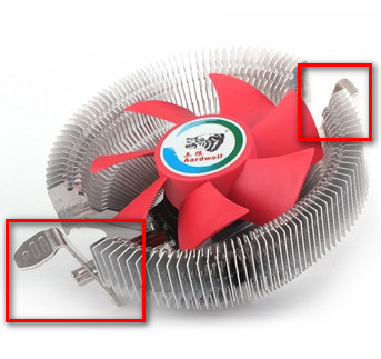 如图所示,两边各有一个可以往下压的铁条,中间是一根弹簧钢条连接。原理就是两边的铁条下压,铁条下方的方口挂到CPU底座的的挂钩上,从而两根铁条和中间的弹簧钢条一起把散热装置固定在CPU底座上。拆除时就应该先按着一边的铁条,使其脱离CPU底座的挂钩,然后像向风扇方向推,使其彻底脱离挂钩,一边拆除之后,另外一边自然就挂不住了