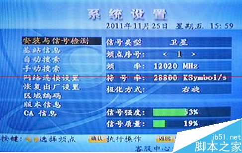 查看“安装与信号检测”下信号强度和信号质量,先调整好天线的仰角,使信号强度和信号质量显示值最大