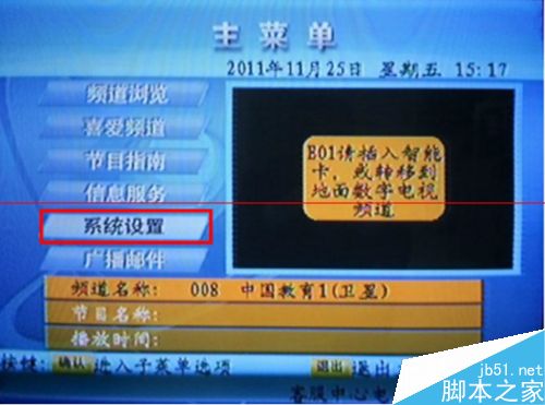 在系统设置界面,进行“自动搜索”,机顶盒即可搜到25套卫星电视(含一路测试图)和14套卫星广播电视节目的列表,按“退出”键可观看测试图,但未开卡安装前,不能收听收看除测试图外的其他卫星广播电视节目。