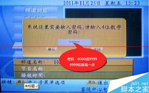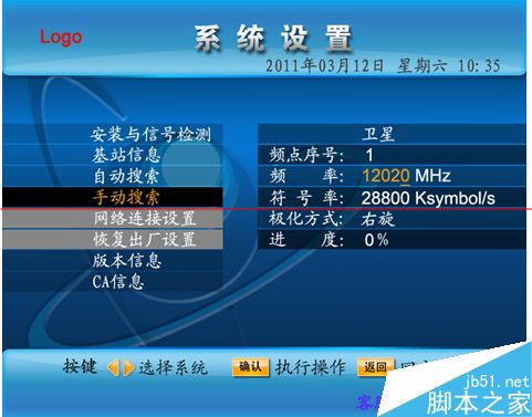 在系统设置界面,输入9999,进行“手动搜索”,设置“频率12020MHz,符号率28800Ksymol/s,极化方式右旋”,即可接收1套测试信号节目