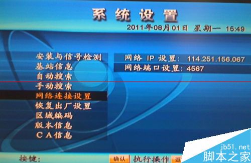 选择“网络连接设置”界面,输入前端位置锁定服务器IP地址(114.251.156.067)和端口号(4567),以便在开卡时机顶盒将相关信息发送到前端位置锁定服务器。