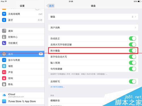 6、在键盘下,有一个【拆分键盘】,将后面的开关关闭,这样即使误碰,键盘也不会分开了