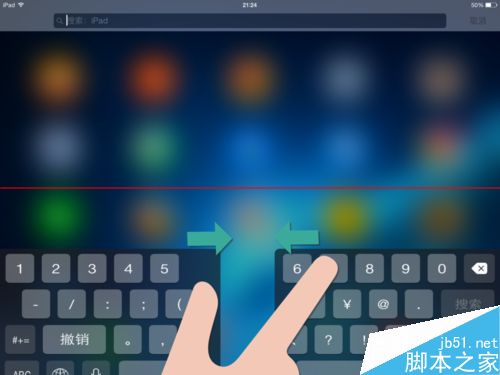 3、这时候,只需要两指按住左右键盘,向中间捏合