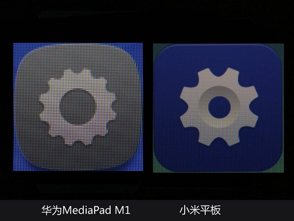 小米平板电脑采用7.9英寸2K超清屏幕,像素密度达到324ppi,屏幕画质无疑是亮点。而华为M1平板电脑采用8英寸720P高清屏幕,屏幕比例16:10,像素密度189ppi,相比超清屏2K屏的小米平板,两者通过仔细或者放大对比后,可以看出为华为M1屏幕颗粒感较强,如下图所示: