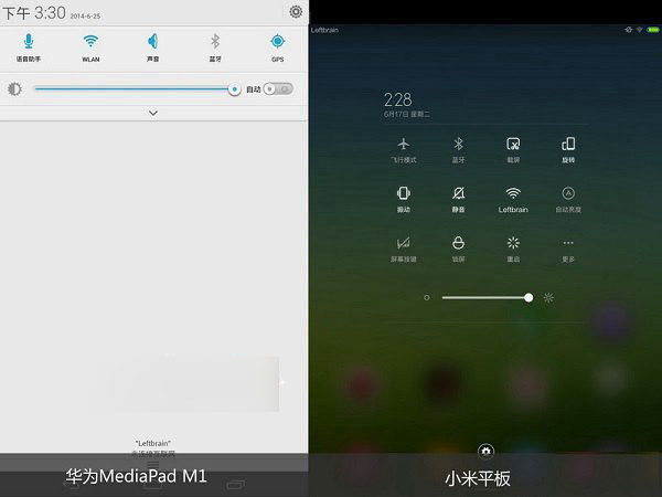 便捷下拉菜单方面,小米平板的通知栏和快捷开关是分开的(系统默认,可以合二为一),通过滑动切换,华为MediaPad M1两部分整合在一起。便捷性不相上下,笔者认为(个人观点,因人而异)小米平板设计更美观。