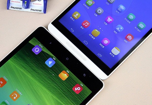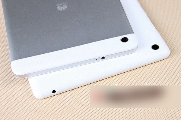 外观方面,小米平板设计模仿的是苹果iPad mini设计风格,不过小米平板按键设计并没有iPad mini那样的个性Home键,另外小米平板采用的是塑料机身,因此尽管与iPad mini风格像,但综合表现还是相差不少。而华为M1平板电脑正面采用的是三段式设计,配备双扬声器,采用铝合金金属机身,外观上有点HTC One手机风格,如下图所示: