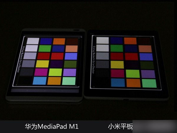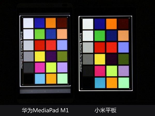 细节方面,小米平板采用全贴合屏幕,理论上说对光折射少,屏幕可视角度更好,结果却恰恰相反。实际测试中小米平板变色严重,反而不是全贴合屏幕的华为M1表现略好,如下图所示。