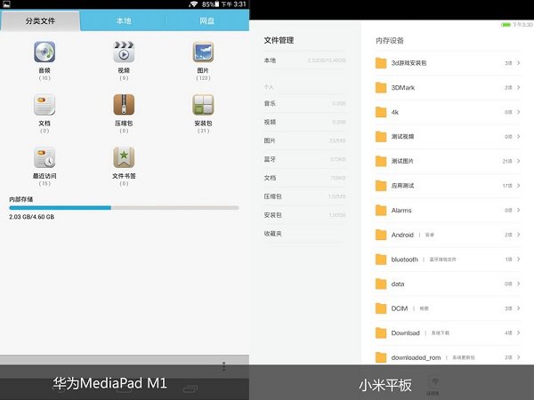 文件管理方面,华为M1加入应用权限管理、电量管理、手套模式等,功能很全面,而小米平板电脑系统应用设计不是很完善,这可能是小米首款产品平板产品,加上是公测版,还是不是特别完善,相信正式版会有所优化。