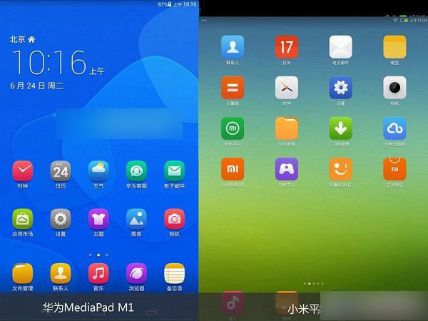 主操作界面方面,小米平板采用扁平化设计,并引入大量毛玻璃元素,界面风格与苹果十分相似,图标也是圆角矩形。华为MediaPad M1同样有扁平化元素,系统默认图标弧度更大,主要是因为面向全球市场,不敢明目张胆侵犯苹果的圆角矩形设计专利。