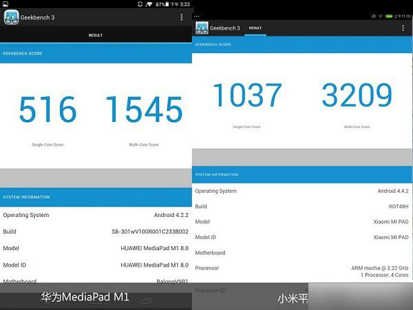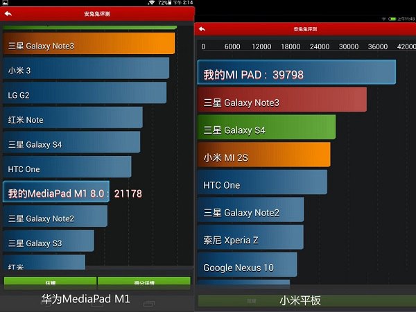 小米平板电脑采用2.2Ghz英伟达Tegra K1四核处理器,拥有192个Kepler架构的GPU核心,与台式机的GeForce显卡采用的GPU架构一致,性能上绝对属于顶级水平。而华为M1平板电脑搭载了自家的华为海思910四核处理器,内置Mali-450MP图形核心。以下是两者的安兔兔跑分对比。
