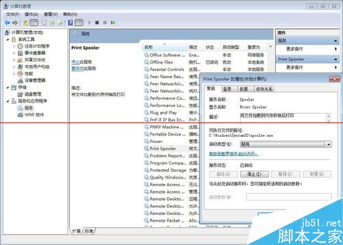 1、请先将 Print Spooler 服务禁用(我的电脑,右键“管理”,服务)(选取禁用,并且停止,点击“确定”退出)。