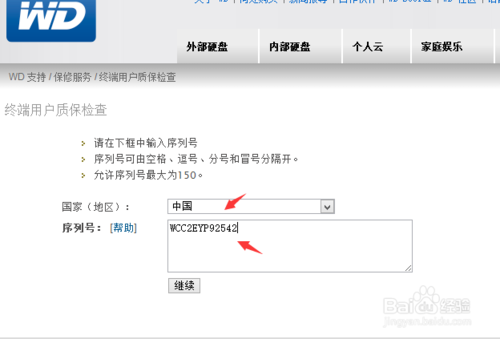 4、进入【终端用户质保检查】。国家选择【中国】,在【序列号:】右边的框中输入刚才的那个序列号,点【继续】。