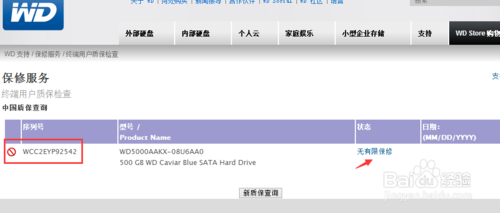 5、弹出结果,就可以看到这个硬盘保修情况了。这个硬盘就没有了。这样的硬盘两种可能,一、就不是正品,二就是厂家直接卖给系统制造商的。这样的质保只有找你买硬盘的商家,如果找不到那就报废。