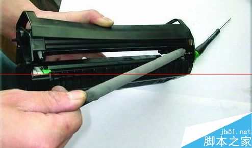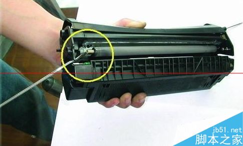 3、取出鼓芯往后,用一字螺丝刀轻轻向上挑出充电辊的一头,将它轻轻抽出。