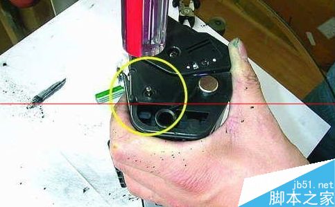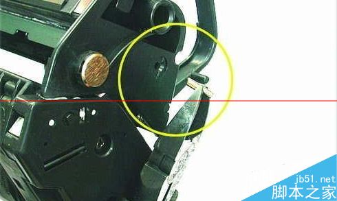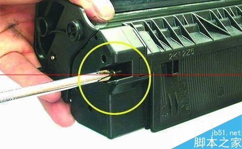 7、用一字螺丝刀把硒鼓另一头充电辊下面的小铁销向外顶出,然后在用斜口钳把刚刚顶出来的小铁销拔出来。