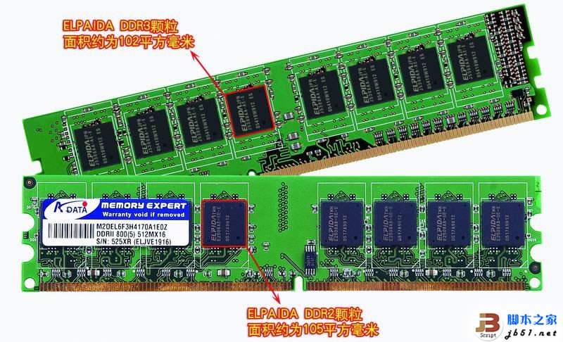 DDR2和DDR3内存的颗粒为正方形,而且体积大约只有DDR内存颗粒的三分之一