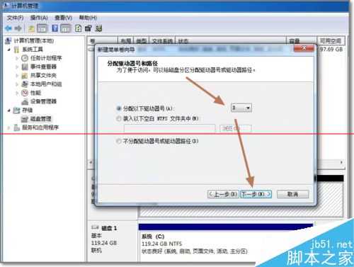 6、为这个分区指定盘号,如有C盘了,系统会按顺序默认指定为D盘。也可以手工指定,设定完成,点击:“下一步”。