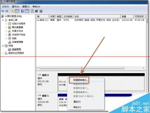 3、记住磁盘的序号,如这里是磁盘0,选择这块磁盘,点击右键,弹出菜单,选择“新建简单卷”。
