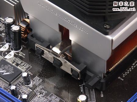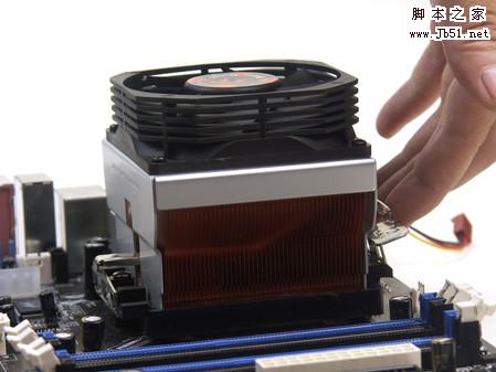 安装CPU散热器时首先要将Tt 金星10A垂直于CPU上方慢慢放下,切忌不要用力。由于主板上大大小小的电容经常会影响CPU散热器的安装,所以小编建议在安装K8散热器时,将没有金属扣具的一端冲里安装。当散热器底部的金属与CPU接触完全后,用力将散热器卡扣与CPU插槽连接在一起。