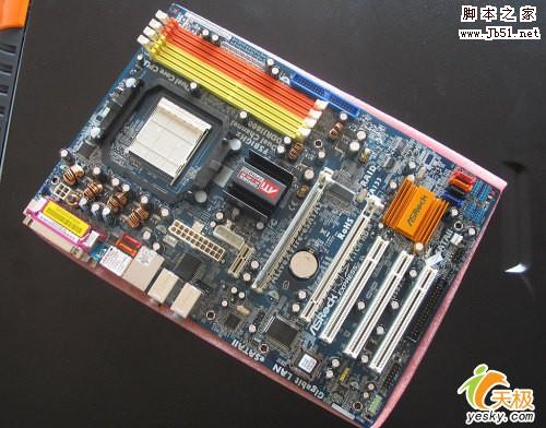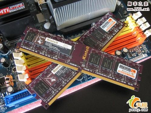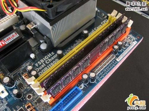 DDR2-800内存与主板上的内存插槽,可以看到主板上提供有四根DIMM内存插槽,桔红色与黄色分别有两根,这样的设计是方便用户组建双通道内存,安装时我们只需要将两条内存插入颜色相同的两根内存插槽中即可。