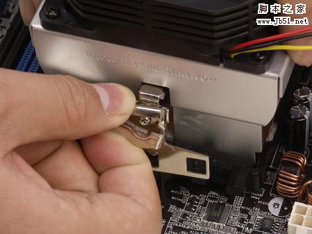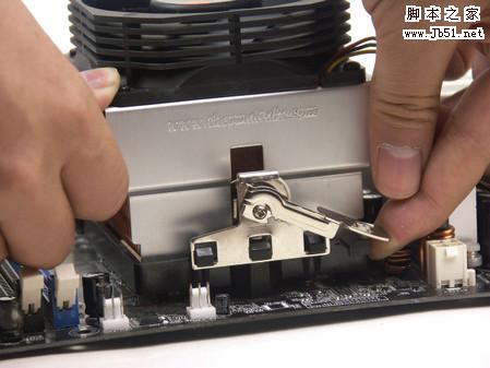 之后是最关键的一步,在确定散热器扣具另一端的卡扣已经与CPU插槽扣在一起之后,在保持散热器底部水平与CPU接触之后,双手用力慢慢将金属扣具一端的卡扣按在CPU插槽上。