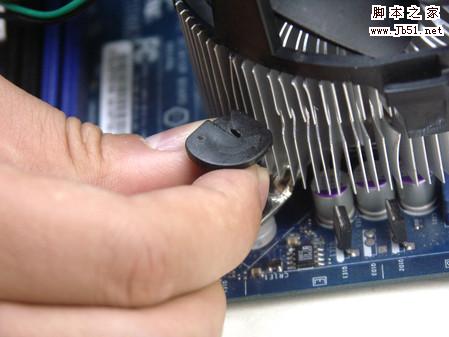 用同样的方法,将另一端散热器与主板CPU支架上的卡扣卡好,这样散热器就被因定在了主板的CPU支架上,为了使其更加牢固,散热器上还提供有卡死的扳手。