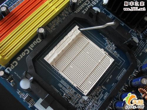 当两端扣具全部打开之后,就可以将CPU散热器慢慢取下。这里需要注意的一点是,由于散热硅脂有可能将CPU和散热器底部金属粘在一起,所以取下CPU散热器的时候一定要垂直取下,以避免将CPU脆弱的针脚弄弯。AMDCPU安装方法!!!(图解)