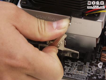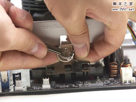 拆卸K8 CPU散热器时首先要将金属扣具拉起至另一端。