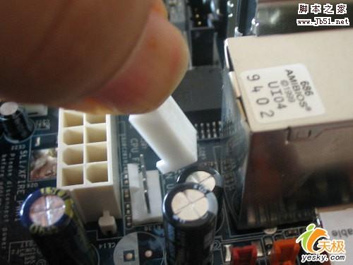 接下来,只需要将散热器上的散热风扇插头正确安装到主板上提供的接口上即可,各个接头均采用防呆设计,反方向是无法插入的。上图中我们可以看到,主板上安装散热器的接口提供了4针,而处理器的接口仅为三针,这里需要特别强调一下的是,四针的风扇接口是为一些转速较高的风扇设计的,由于AMD的发热量并不大,因此散热风扇的转速并不太高,所以这里提供了三针的接口。不过这样的接口同样适用于主板上的四针插口,安装上同样采用防呆式的设计,一目了然。