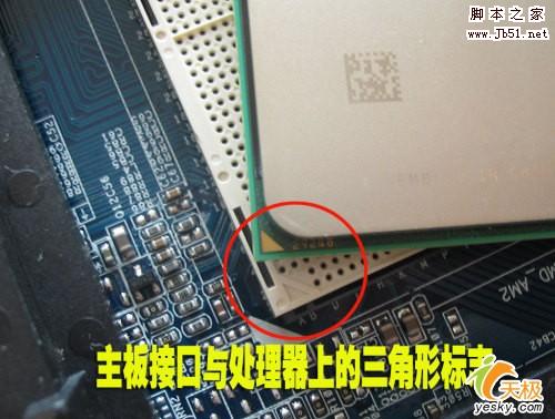 第二步,将处理器上印有三角标志的一端与CPU插槽上印有三角标志的一端对齐,即可以将CPU与插座固定好。