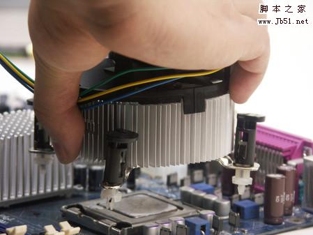 LGA 775散热器周围分布四个塑料扣具,当CPU正确安装之后,我们在放置LGA 775散热器时需要注意将散热器的四个扣具对准CPU插槽上的相应位置。