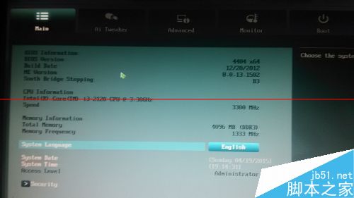 3、进入bios设置界面,首先看到的是main(概要)选项卡,默认语言是English,当然也可以手动选择为简体中文