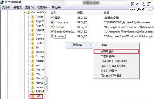 同样在开始菜单输入“regedit”来打开注册表编辑器,然后一级级选择,直到找到HKEY_CURRENT_USER/Software /Microsoft/Windows/CurrentVersion/Run。接下来在右侧栏的空白处点击鼠标右键,新建一个“字符串值”。