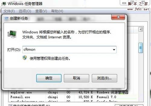 添加进程的方法其实也很简单,在“文件”中选择“新建任务(运行)”,在输入框中输入“cftmon”,点击确定,现在一般用户应该都能找回输入法图标了。