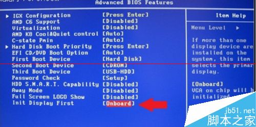 6、接着进入CMOS,选择“Advanced BIOS Features”(基本BIOS设置)界面,从中找到“Init Display First”项,将右侧的设置修改为非“主板”类型即可将电脑内置显卡关闭。如图所示: