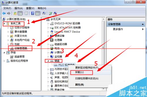 6、这就打开了【计算机管理】窗口,我们依次单击打开【系统工具】-【设备管理器】-【键盘】选项,右键单击【标准键盘】,再单击【卸载】选项。如下图所示。