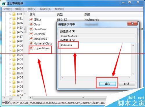 8、然后将新建的”多字符串值“命名为【UpperFilters】。然后双击打开这个多字符串值,将数值数据更改为”kbdclass“,再单击【确定】按钮,最后退出注册表。这样就可以成功解决键盘输入错误的问题了。如下图所示。