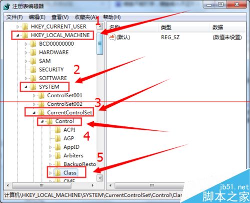 3、这时候就打开了【注册表编辑器】窗口,在窗口中依次打开【HKEY_LOCAL_MACHINE】-【SYSTEM】-【CurrentControlSet】-【Control】-【Class】选项。如下图所示。