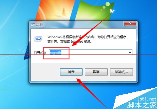 2、然后在【运行】窗口的对话框中,输入”regedit“命令(如果无法输入的话,可以复制粘贴进去),再单击【确定】按钮。如下图所示。