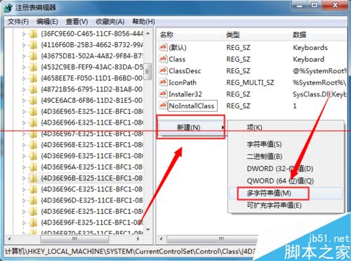 7、卸载成功以后,我们回到刚才的注册表{4D36E96B-E325-11CE-BFC1-08002BE10318}选项,在右侧窗口右键单击空白处,然后单击【新建】-【多字符串值】选项。如下图所示。