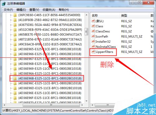 4、然后在【Class】选项的目录下,找到{4D36E96B-E325-11CE-BFC1-08002BE10318}选项项,打开以后,在窗口右侧找到【UpperFilters】值,并将它删除。如下图所示。