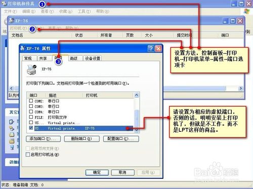 3、设置相关的打印机端口:如果不能正确设置端口的话,就会明明装上打印机,也不能正常工作、不打印。端口你不能设置为系统默认的LPT,因为这是你接原来LPT线的时候才能用的,而现在你接的是USB转并口线,所以要设置为USB虚拟端口。