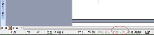 4、查看word下方的状态就可以判断出了。改写状态是灰色的就是退出改写状态,变黑就是进入改写状态了。